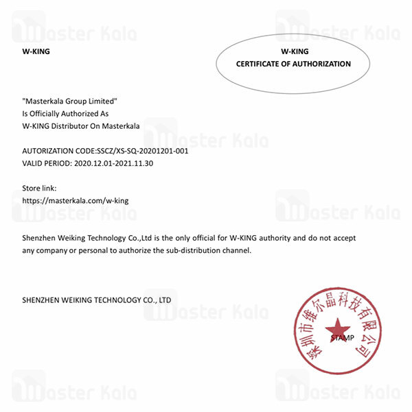 در حال حاضر طیف وسیعی از محصولات جدید W-King در فروشگاه اینترنتی مسترکالا موجود شده و همزمان با این موضوع گواهینامه فروش محصولات اصلی و ارجینال از شرکت W-King دریافت شده است. گواهی که در انتهای این متن مشاهده می فرمایید گویای این مسئله است که تمام محصولاتی که از برند W-King در سایت به فروش می رسند اصلی و ارجینال هستند و این موضوع توسط شرکت بررسی و تایید شده است.