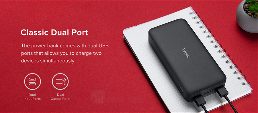Xiaomi Redmi PB200LZM با وزن 420 گرم و ابعاد 27 × 73.6 × 154 میلی متر خود دارای دو پورت USB خروجی می باشد که هرکدام توانی معادل 2.4 آمپر دارند. پاوربانک شیائومی Redmi 20000 جمعا دارای 4 پورت است که دوتای آن USB بوده که در ابتدا توضیحات آن داده شد. دو پورت دیگر اما یکی Micro USB و دیگری تایپ سی است که هر دو برای شارژ خود پاوربانک می باشد.