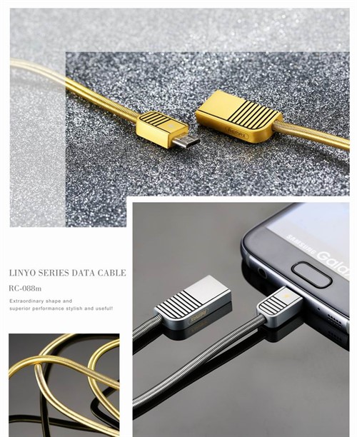 RC-088m Linyo یکی از کابل های جدید شرکت ریمکس بوده که دارای طراحی و ساختار کم نظیری است که سبب شده این محصول از حیث ظاهر از دیگر کابل ها متمایز شود.درون این کابل از 5 لایه کابل نانو برای افزایش سرعت و مقاومت استفاده شده است.Remax RC-088m بدنه ای همانند زره داشته و مانند آن نیز عمل می کند که به سبب بدنه زره ای از مقاومت فوق العاده ای در برابر گره خوردن،پیچیدن،کشش،فشار و ضربه برخوردار است.