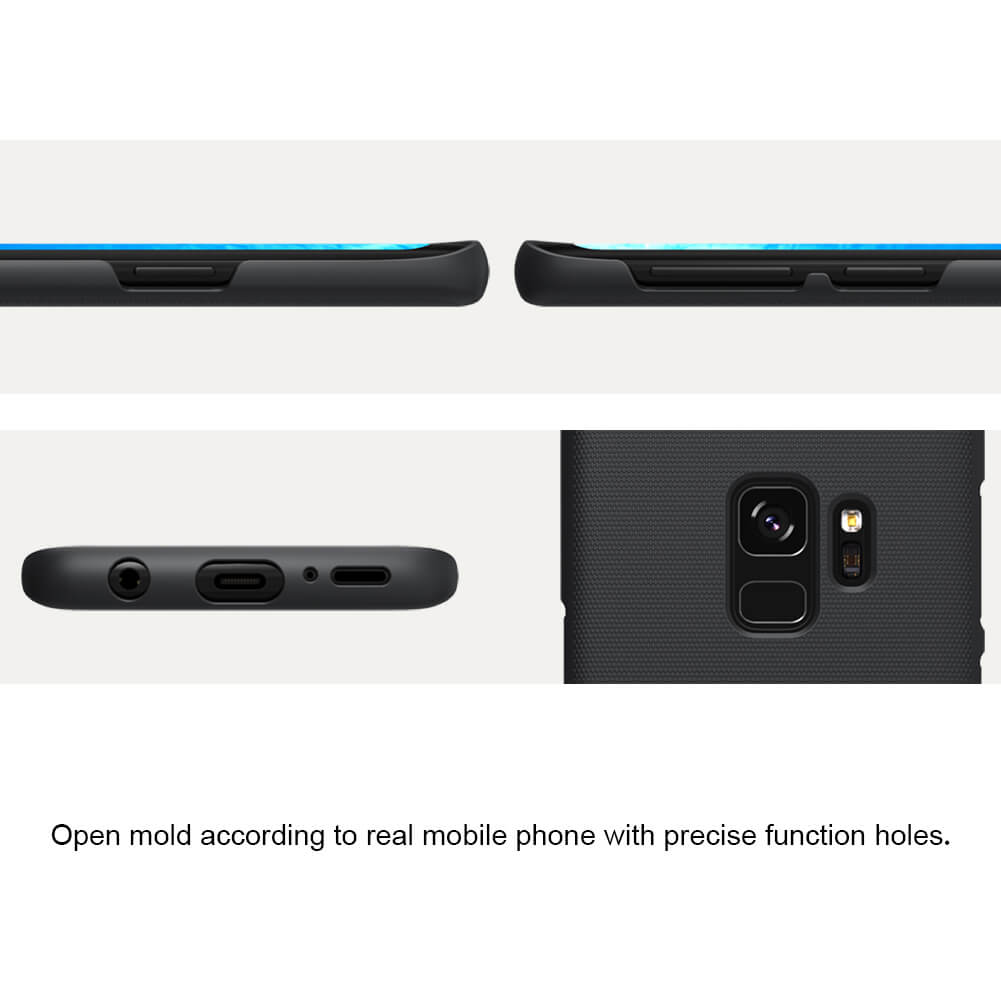 کاور محافظ نیلکین مدل Frosted Sheild یک کاور سخت PC سازگار با محیط زیست می باشد.کاور سطحی با دانه های ریز برجسته داشته که باعث عدم لیز خوردن گوشی هنگام کار با آن می شود این کاور به خوبی از قاب پشتی و لبه های جانبی گوشی محافظت می کند.مدل های Frosted Sheild همانند سایر محصولات برند نیلکین از کیفیت ساخت بالایی برخوردار می باشد و با دقت بالایی بر اساس ابعاد و اندازه های گوشی طراحی و ساخته شده اند.هر دو طرف قاب مات و مقاوم در برابر ضربه،شوک،گرد و غبار و ضد اثر انگشت است.داخل پک این کاور یک عدد محافظ صفحه نمایش مناسب سامسونگ گلکسی اس 9  نیز قرار دارد.